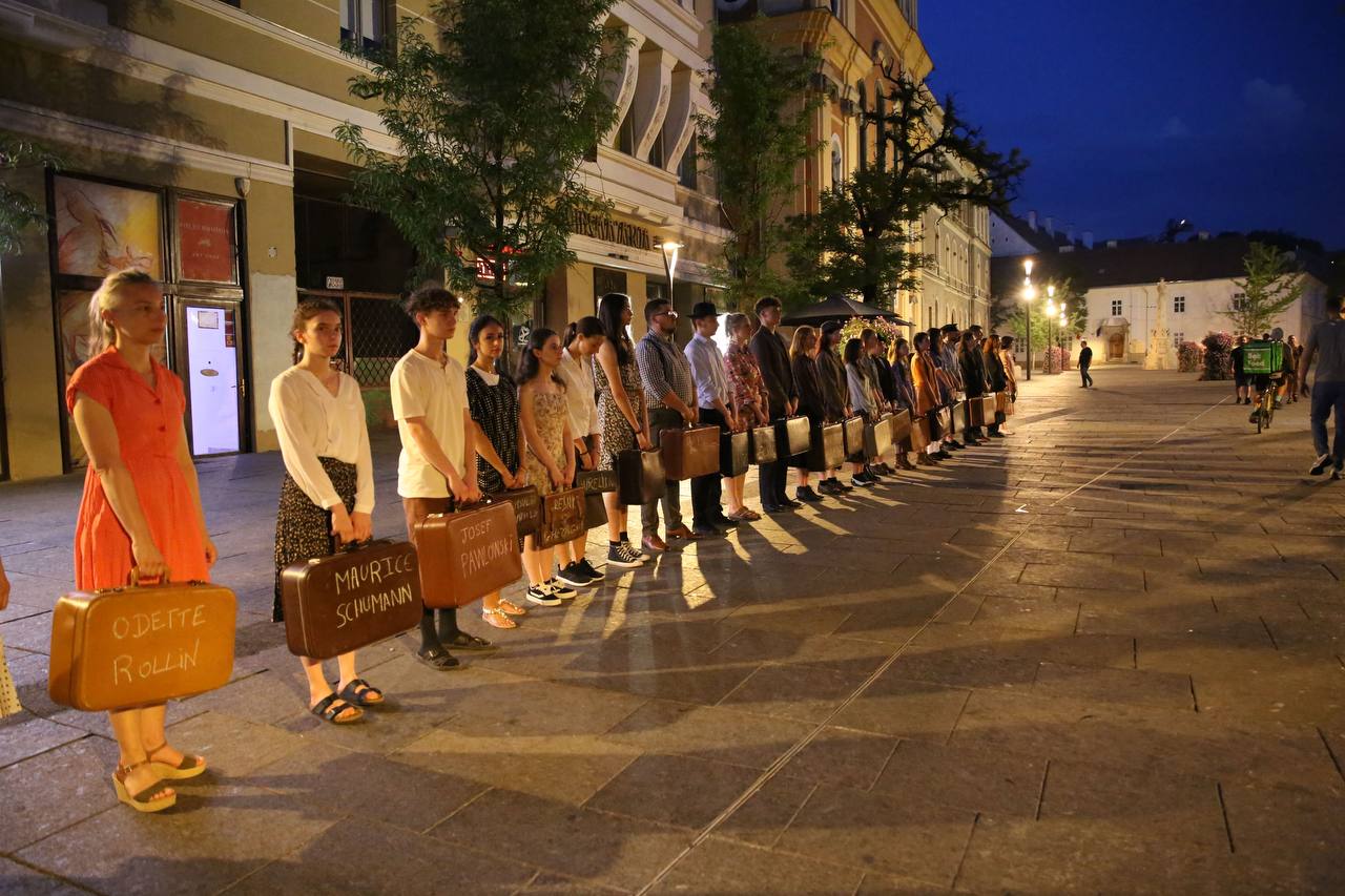 Le lendemain, on part Ă  Cluj-Napoca. On fait des rĂ©pĂ©titions dans le bĂątiment biodiversitĂ© de l’USAMV (Universitatea de Stiinte Agricole si Medicina Veterinara). C’est de lĂ  que l’on dĂ©bute notre marche de la MĂ©moire. Valise dans la main, nom Ă©crit Ă  la craie de celle ou celui qui nous sont (Ă©taient) cher.e.s ; robes, vestes, pantalons des annĂ©es 1930. On bourlingue, on s’arrĂȘte prĂšs des tramways, au pied du monument des MĂ©morandistes, prĂšs de l’OpĂ©ra Hongrois, dans la vieille ville.