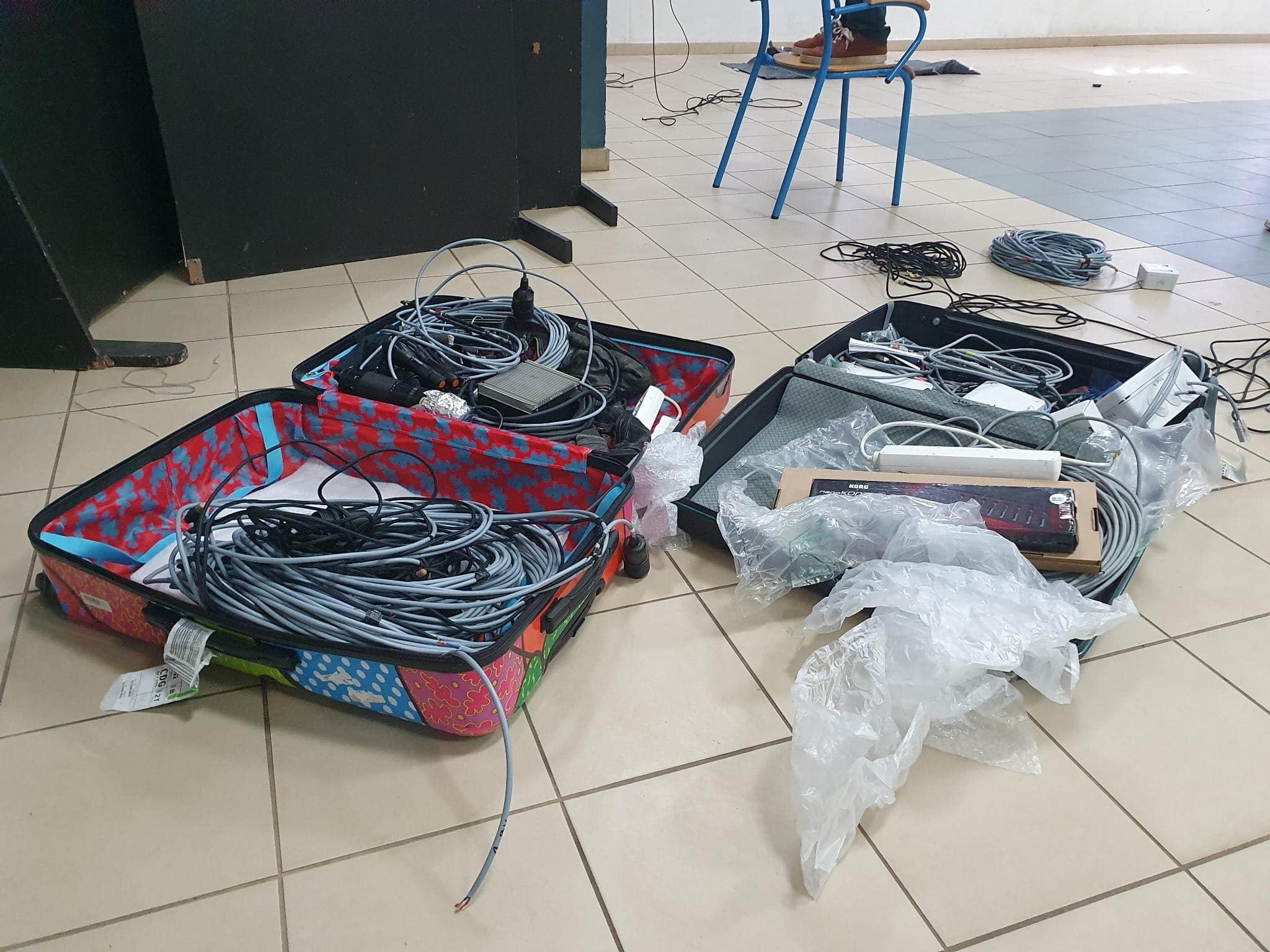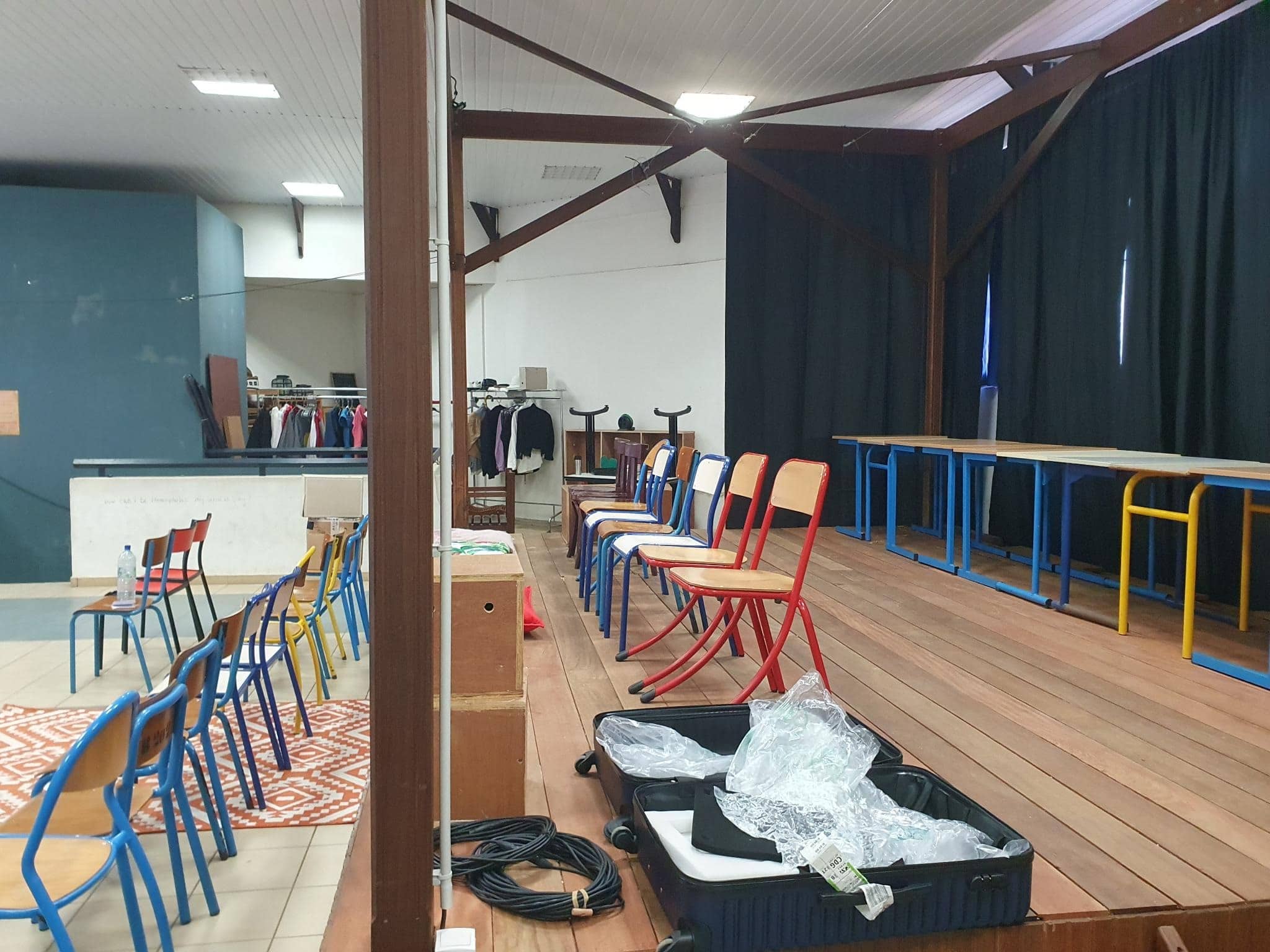 L’équipe de Procédé Zèbre au complet arrive dans la salle de théâtre du Lycée. Ils scotchent des sacs poubelles sur les portes vitrées, et cherchent à faire le noir. Les rideaux bleus, épais et ondulés, sont un défi. Pierre Valente Géo Trouvetou et Fabrice Dubusset réfléchissent. Derrière eux, Christophe Nurit, délicieux musicien, installe des enceintes aux deux extrémités de la salle. Il ouvre les valises récupérées au Camp de la transportation, en sort les câbles qu’il déroule. Il en met partout. On lui dit que le son prend déjà toute la place, que ça suffit les techniciens du son qui n’en font qu’à leur tête et que, quand même, il faudrait laisser la scène au comédien. On rit.