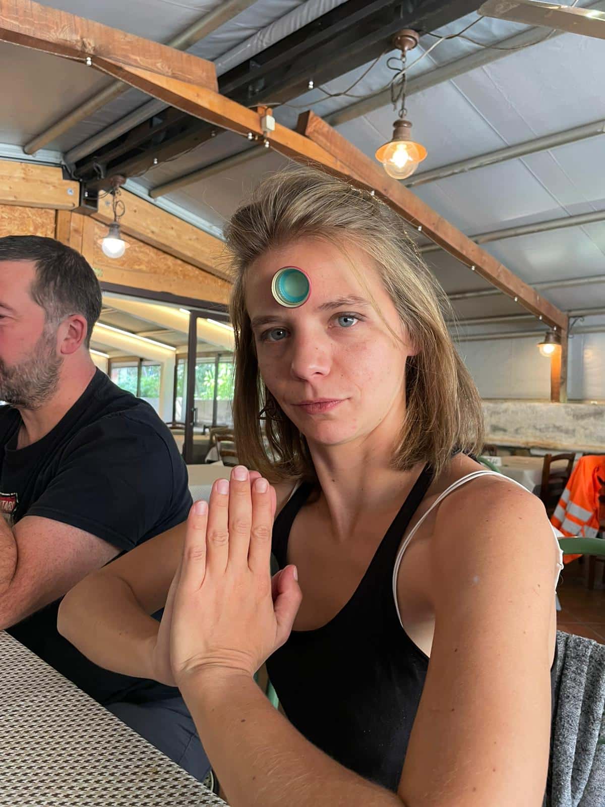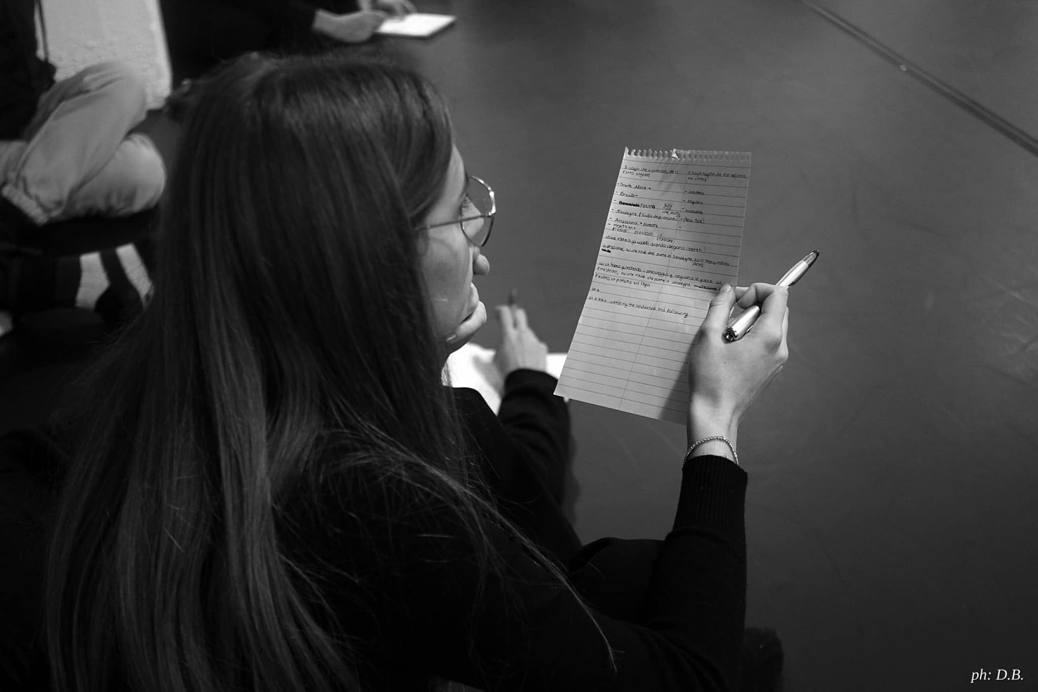 There is a discreet girl with round glasses and red hair. She is easy to recognize, she pulls up her glasses with her right index finger and tries not to be seen. Her smile announces that it is not there. Her smile announces that she is not either. Moreover, her too big sweater says the same thing. She disappears into the void that it opens around her hips. She laughs, astonished to be there, in the middle of it, in the middle of her mauve sweater.