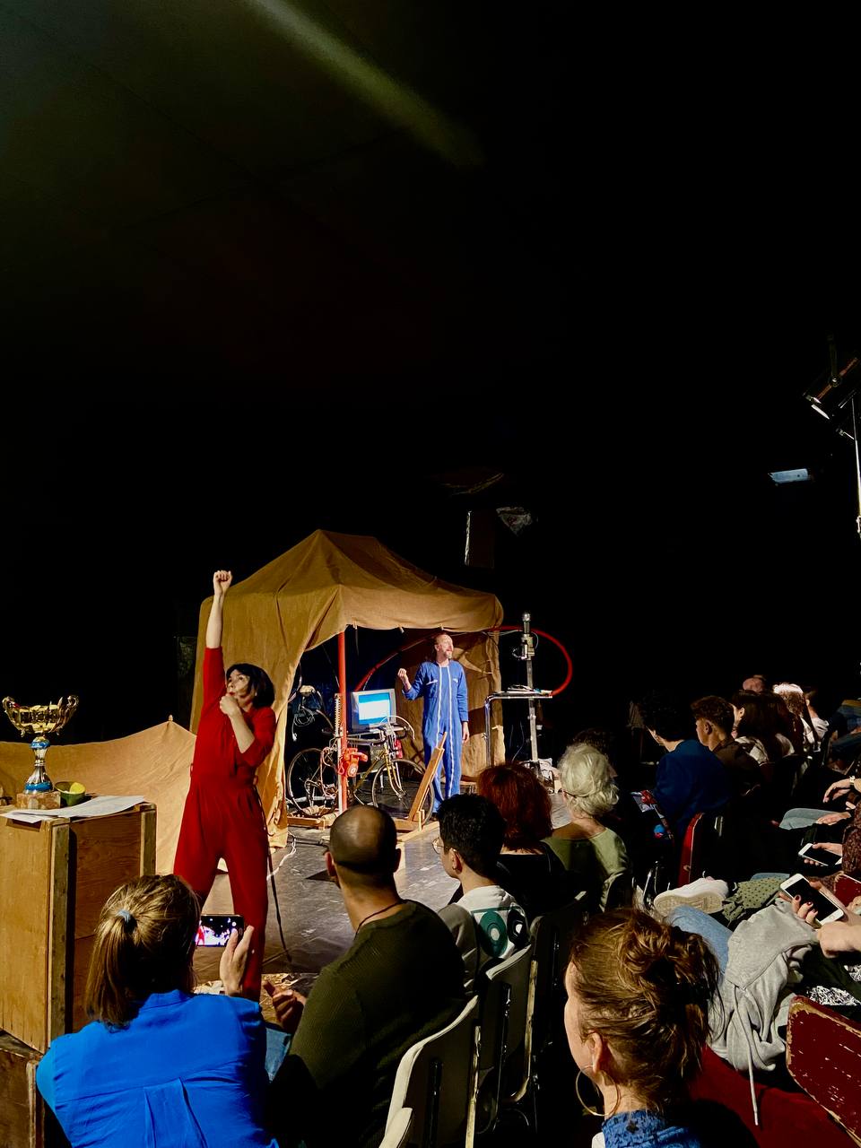 Entretemps, dans les locaux même, on assiste à la première répétition publique du spectacle « Recycliste » écrit et joué par Arnaud Redon et Frédérique Mille. Cette représentation s’inscrit dans la lignée du spectacle « Cycliste » et va être montrée au grand public de l’Allier à partir d’août.